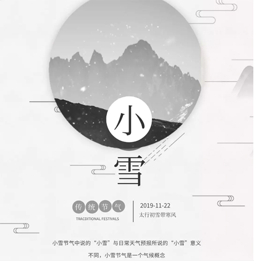 小雪,24节气中的第20个节气,在公历11月22日至23日入节,时太阳到达黄经240°。小雪和雨水、谷雨等一样,都是直接反映降水的节气。小雪表示降雪的开始,天气转变,由冷转寒,也应做好身体的防护。