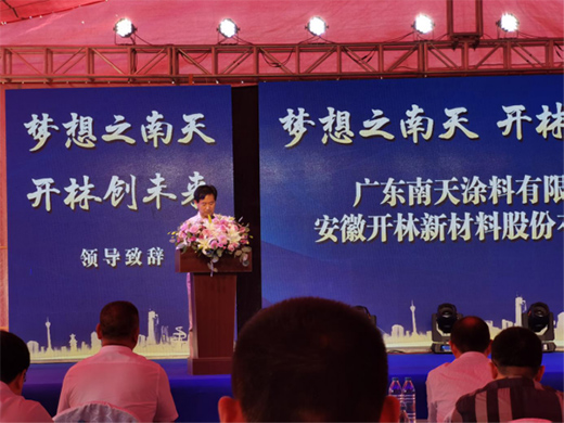 会上,天长市副市长周继安、广东涂料协会会长陈冰、安徽开林董事长王和山及受邀前来的当地行业领导都发表了重要讲话,为华东区生产基地的未来指明了正确的方向并对其寄予了期许。随后,天长市政协主席董学文和陈冰会长为南天涂料华东生产基地揭牌。