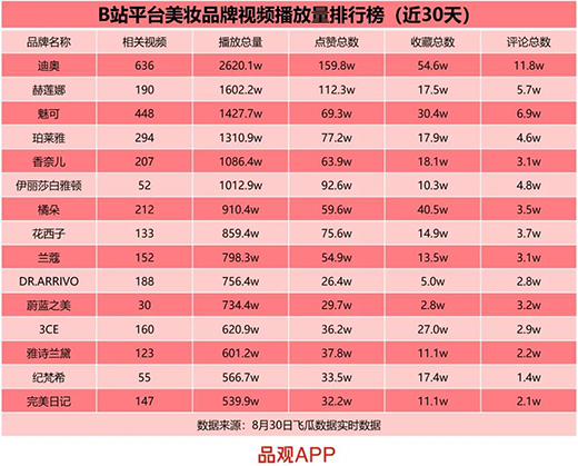 同时,根据飞瓜数据,品观APP梳理近30天B站美妆品牌播放总量排行榜发现,数个美妆品牌的单月视频播放量超千万。其中,迪奥相关视频播放量为2620.1w次,位列第一,赫莲娜和魅可紧随其后,挤进前三。珀莱雅、橘朵、花西子也纷纷入榜,分列第4、7、8位。