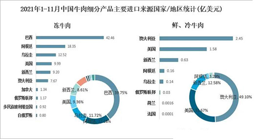 从进口来源国家/地区来看,2021年1-11月中国从巴西进口冻牛肉的进口金额为42.46亿美元,占全国冻牛肉进口总额的39.75%,占比最大;从阿根廷进口冻牛肉的进口金额为18.35亿美元,占全国冻牛肉进口总额的17.18%;从乌拉圭进口冻牛肉的进口金额为12.52亿美元,占全国冻牛肉进口总额的11.72%。2021年1-11月中国从澳大利亚进口鲜、冷牛肉的进口金额为2.45亿美元,占全国鲜、冷牛肉进口总额的49.10%,占比最大;从美国进口鲜、冷牛肉的进口金额为1.58亿美元,占全国鲜、冷牛肉进口总额的31.67%;从新西兰进口鲜、冷牛肉的进口金额为0.63亿美元,占全国鲜、冷牛肉进口总额的12.58%。