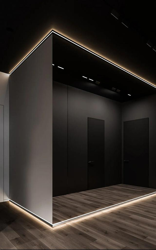 墙面的灯带多是内嵌式的,在一个合适的地方嵌入灯带,让平平无奇的墙面看起来很丰富,也很精致。墙面的灯带还可以与顶面相连,效果更突出。