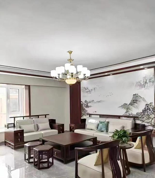 客厅空间围合式的中式实木家具,真实地展现出实木的独特品味:自然、高档、厚重。搭配大气磅礴的水墨壁画,打造了一个古典又儒雅的新中式时尚之家。