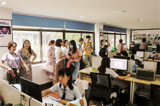 2020年8月6日,单仁资讯中山公司总经理范鲜其及牛商会的30余位优秀企业家莅临柏克体育参观指导,柏克体育董事长宋新国热情接待,陆续参观了园区办公环境、展厅及品牌墙。