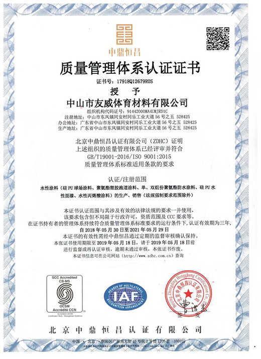 友威体育产品绿色环保,安全有保障。塑胶跑道材料、硅PU球场材料、丙烯酸材料、人造草坪是经国家体育用品质量监督检验中心认定的优质产品,并获得“中国环境标志产品认证”、“质量过硬信誉品牌”和“绿色环保信誉放心品牌”等荣誉,其产品已经走进湖南长沙华天大酒店、山东信发集团、鄂州中学肇庆市横山镇文杰中学、佛山上林苑小学等企业和学校。