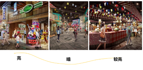二是突出强调商品的店铺光。其中,街道悬吊的(灯)光能,营造夜市氛围,并且遮挡天花裸露的结构与管线;路灯作为点缀,打造出马路既视感;丰富多样的店招带来热闹的既视感。