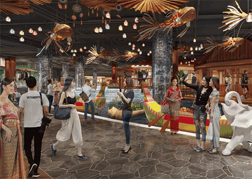 从整体平面空间上看,需打造以店铺亮、街道暗的整体灯光氛围;在打卡景点,加强环境光和面光的补充,有利于顾客拍照;在水景区域,需要重点刻画和突出,用流动的“水”元素,增加商业空间氛围美的同时,加强了东南亚地区对水蕴含的情感的民族特色文化传达。