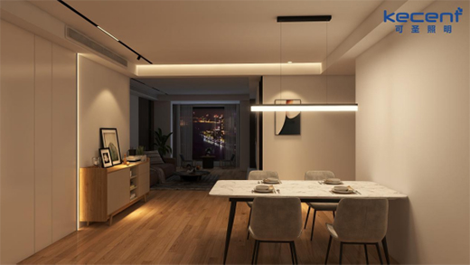KECENT可圣照明:民以食为天,餐厅作为“食”之所在,在灯光设计方面自然容不得一丝马虎。从如今的商品房户型来看,餐厅既有空间较为宽敞的独立模式,又有客餐厅一体及餐厨一体的模式,后两者在考虑灯光设计时既要考虑餐厅自身的光照使用情况,又得结合客厅或厨房的灯光需求,因而更考验设计师的功力。