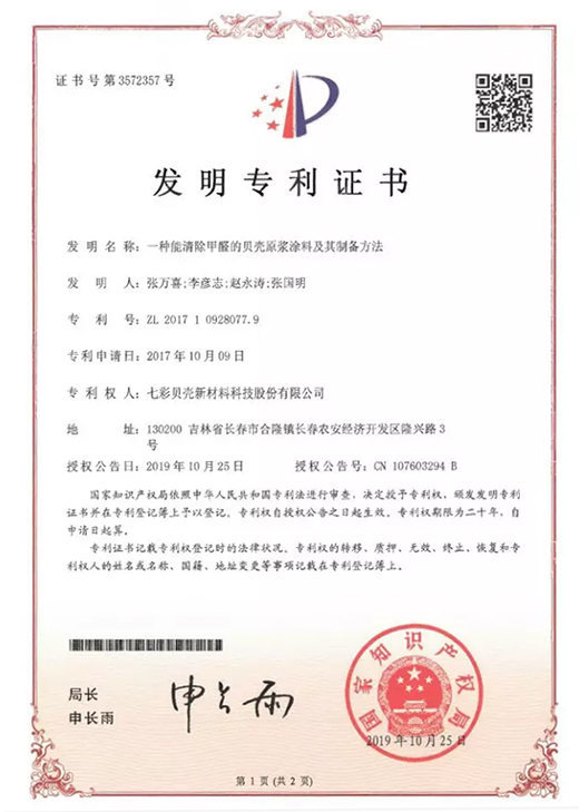 由七彩贝壳公司科研团队研发的“一种能清除甲醛的贝壳原浆涂料”近日已获得国家发明专利,ZL201710928077.9。
