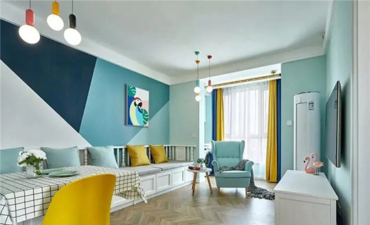 客厅背景墙是展现小清风的重点位置,最重要的位置当然要搭配的最漂亮显眼。墙面选用几何色块拼接,色彩选择绿色的同色系,这样的拼接设计简直太漂亮了!这么漂亮的设计当然不能只能放在小小的沙发背景墙。所以这整面墙都都采用这样的搭配,不仅在视觉上起到延伸的效果,而且将这面墙完美的呈现在眼前,让人眼前一亮,立马确认这是小清新无疑了。