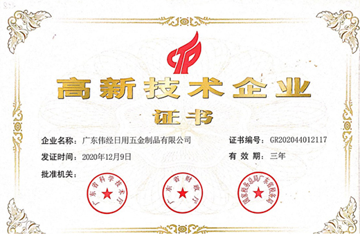今年年初,广东伟经金属、广东伟经188金宝慱官网app荣获广东2021第三批高新技术企业认证。获得国家在高新技术领域重点支持,代表着广东伟经集团研发成果在国内得到认可,而这也是广东伟经集团长期坚持创新研发结出的硕果。