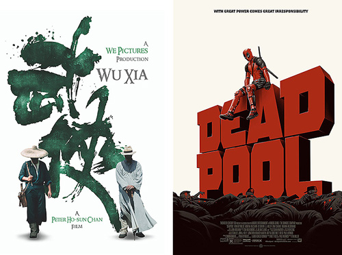 上左图将书法的“武侠”二字作为画面主视觉进行处理,而右图则直接将死侍坐在类似3d处理后的电影名字上,很好的融入到了画面中。运用到网页设计当中如下:
